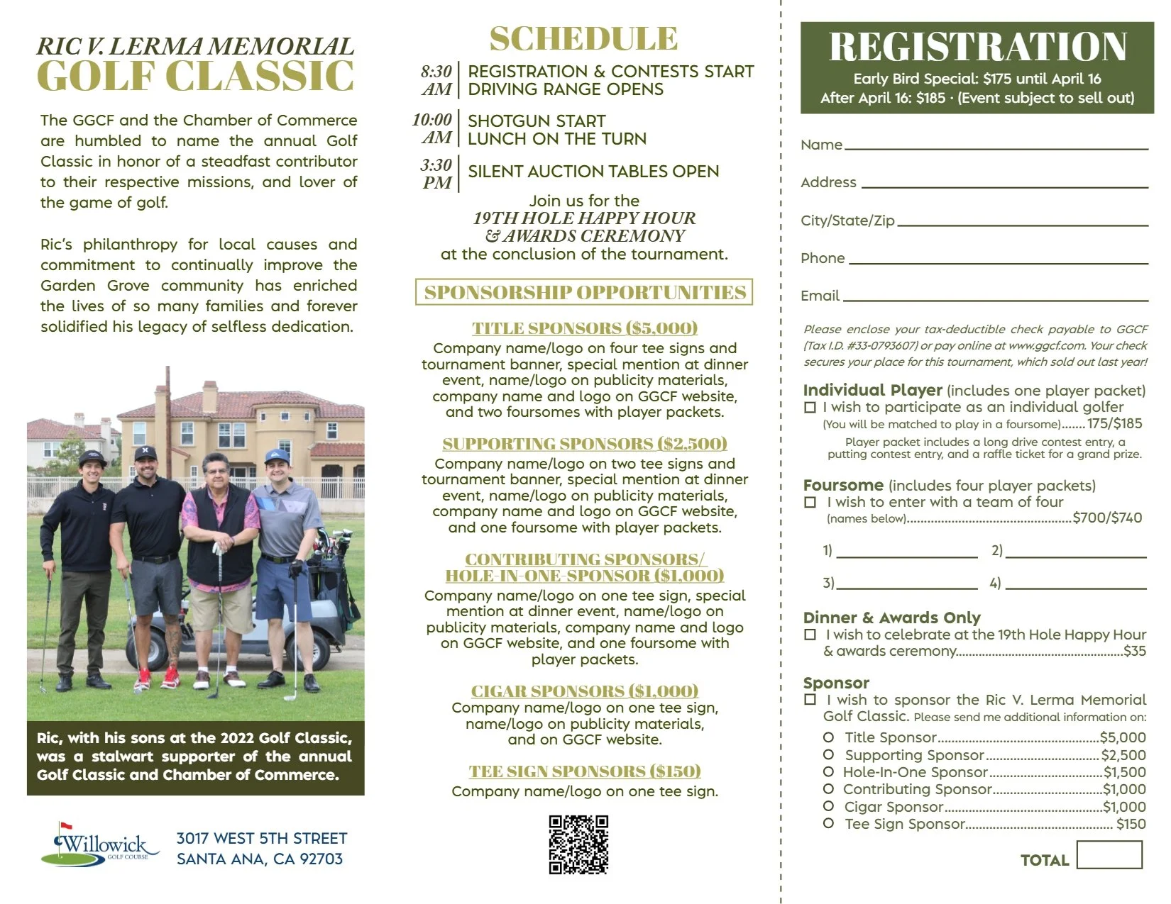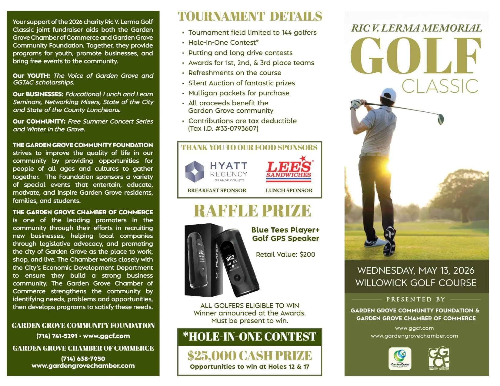 Join us as we continue Ric’s legacy of this fun-filled day of golf, food & drink at Willowick Golf Course, 3017 W. 5th Street, Santa Ana. All proceeds will benefit both the Garden Grove Community Foundation and the Garden Grove Chamber of Commerce.